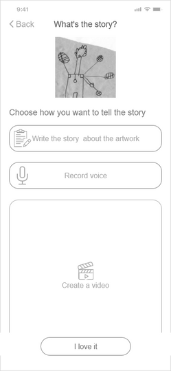 Choosing contrasting base colors, graphic elements and hand drawn characters. Icons were chosen to be similar to children's drawing style to provide the user experience of artwork full of imagination. Designing with the goal to encourage the user to keep using the app.